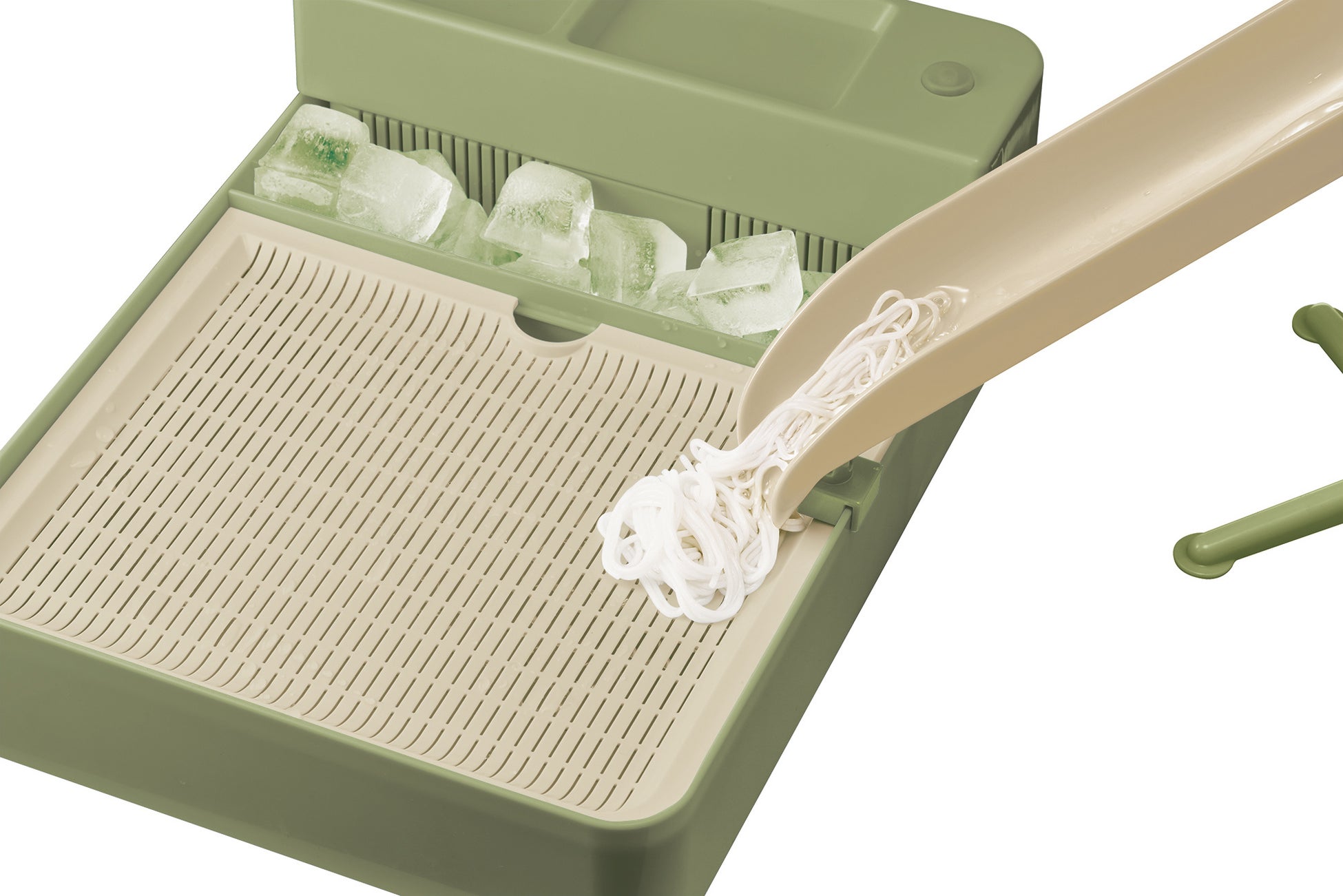 流したそうめんをザルがキャッチし、水がきれてそうめんがのびにくい設計です。また、氷を入れるポケットがあるため、氷をいれて冷水を循環させることができます。