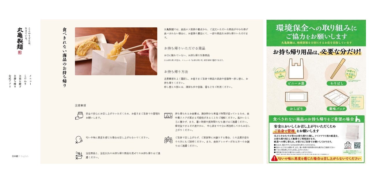 例えば「食べ残し持ち帰り促進ガイドライン」への対応に関しては、讃岐うどん専門店「丸亀製麺」では、食べ切れなかった天ぷらやおむすび等のお持ち帰りをお客様がご希望になる場合、テイクアウト用の紙袋をご提供しています。また、丸亀製麺における「エコKAN店舗※(環境配慮型店舗)」ではポップにてお客様に向けたご案内を行うとともに、広くウェブサイトでお持ち帰りのご案内をしています。