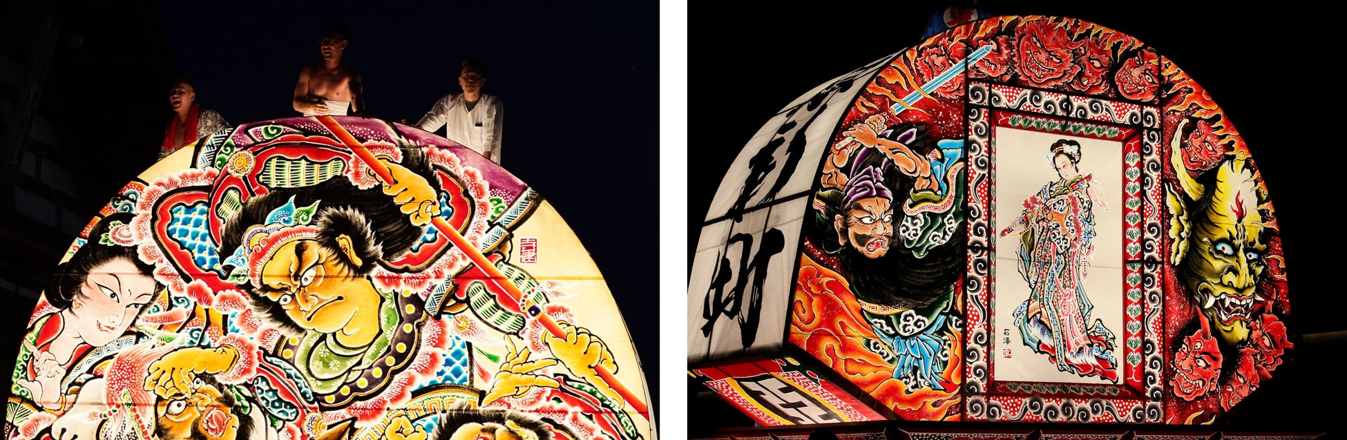 黒石ねぷたは背面に描かれる見送り絵が大きな特徴で、表面に描かれる武者絵に対して美人画が描かれます。これは、表面の豪華絢爛たる動の世界に対して徹底してもの寂しさを追求する静の世界を表しています。五段高欄と呼ばれる独特の形式は「青森県無形民俗文化財」に指定されており、約30台のねぷたが一ヵ所に集まる合同運行が行われます。青森県では、青森市の「人形ねぶた」、弘前市の「扇ねぷた」が代表的ですが、黒石ねぷたは、「人形ねぶた」と「扇ねぷた」を同時に楽しめる稀少な祭りです。