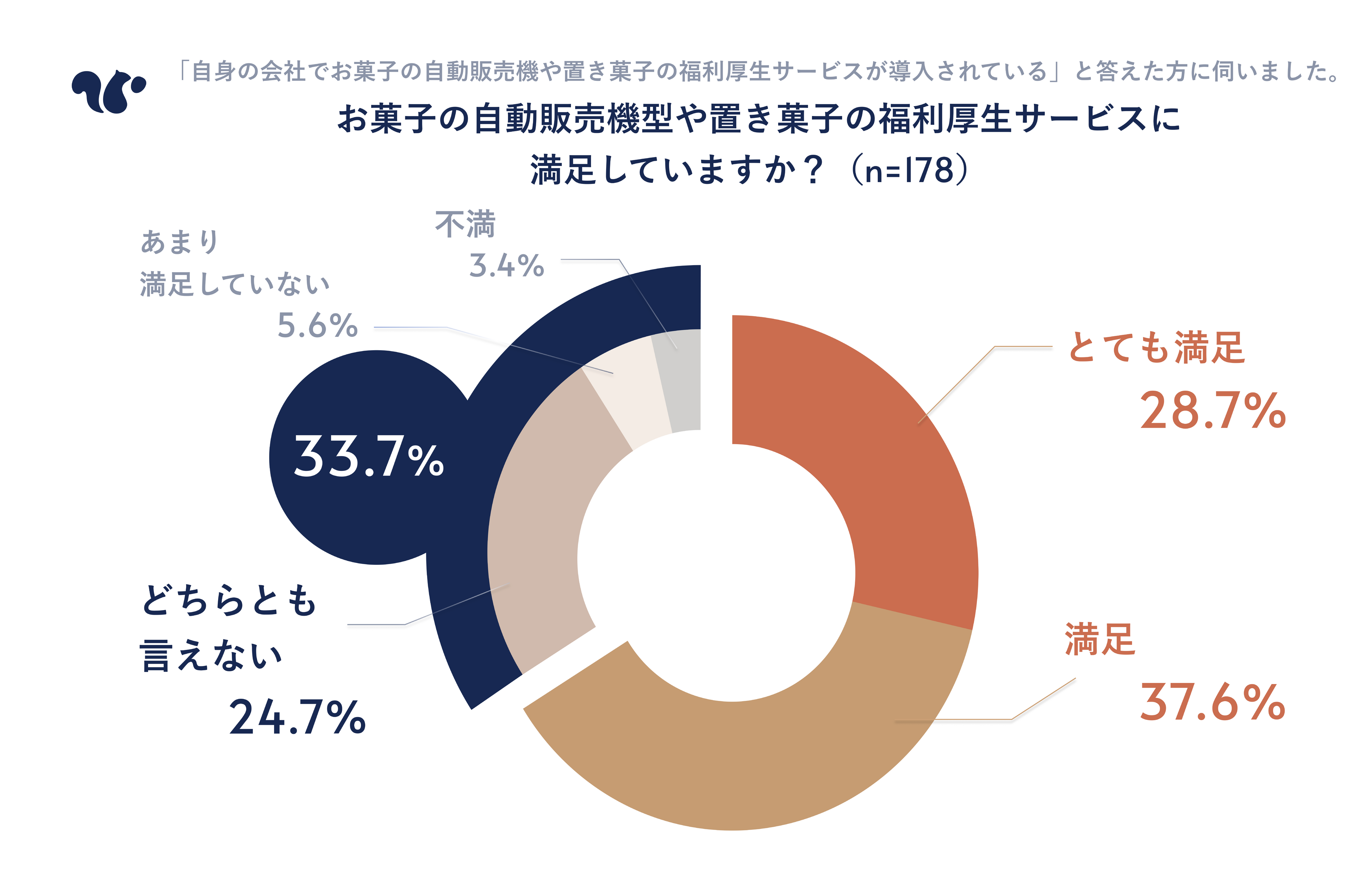 同じくお菓子の自動販売機や置き型の福利厚生サービスを導入している人に対して、その満足度を聞いたところ、こちらも「不満(3.4%)」、「あまり満足していない(5.6%)」、「どちらとも言えない(5.6%)」のいずれかを答えた人が合計で33.7%となり、3人に1人の割合で利用者は満足はしていないという結果になった。