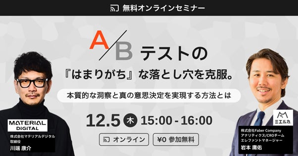 株式会社Faber Company(ファベルカンパニー/本社:東京都港区、代表取締役:稲次正樹・古澤暢央)は、「A/Bテストのはまりがちな落とし穴を克服」をテーマに、株式会社マテリアルデジタルと共催ウェビナーを実施いたします。