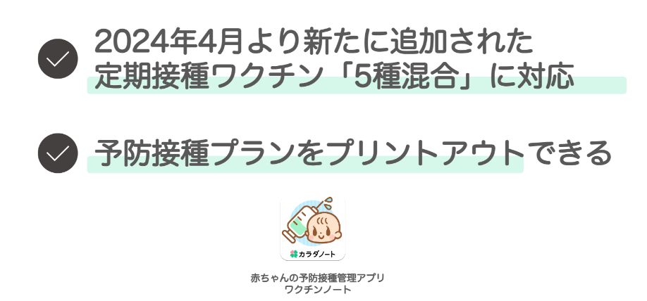 赤ちゃんのワクチン接種記録管理アプリ「ワクチンノート」、新たな定期接種ワクチン「五種混合」に対応