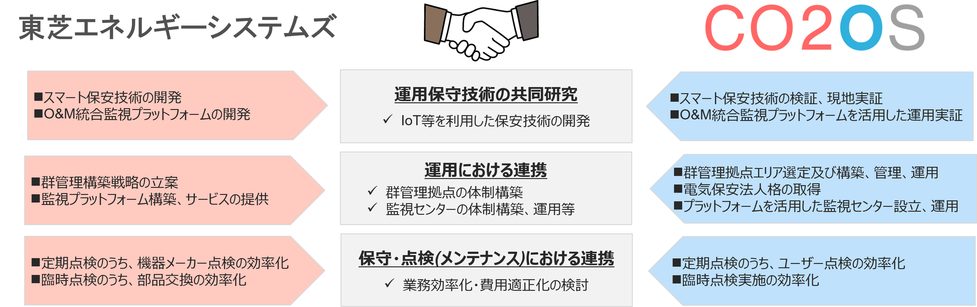 東芝エネルギーシステムズ株式会社(以下「東芝ESS」)、株式会社CO2OS(以下「CO2OS」)及び大和エナジー・インフラ株式会社(以下「DEI」)は、日本国内の太陽光発電所の開発、EPC(注1)、運用保守業務等の事業領域における技術の高度化及び事業拡大に向けた協業体制の構築を目的として、業務提携契約を締結しました。