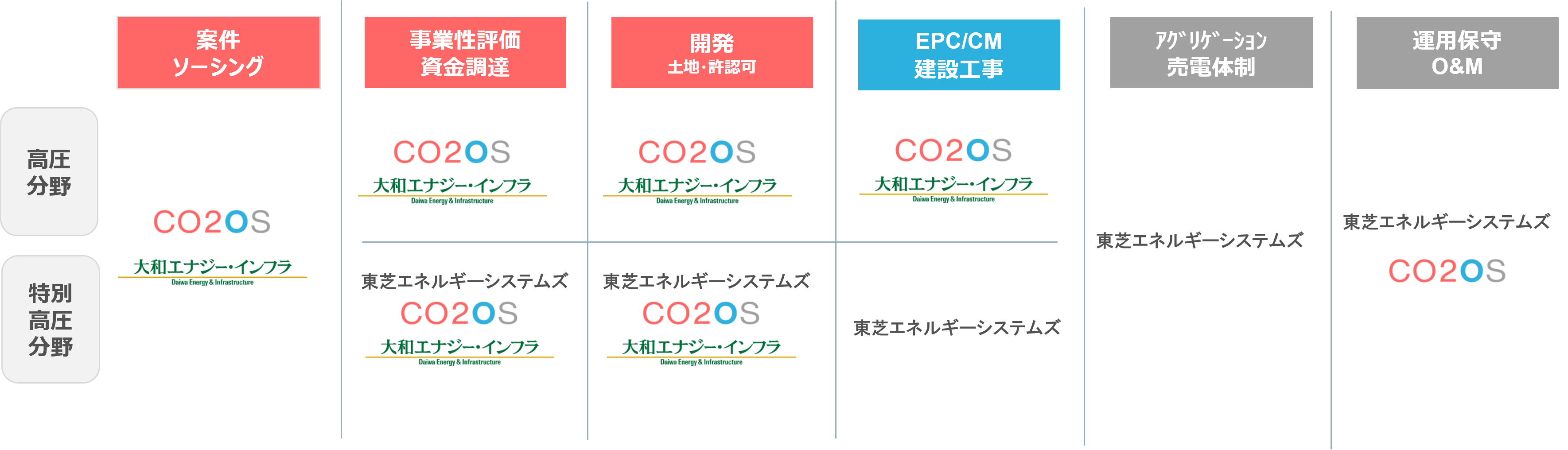 新規の発電所開発においては、東芝ESSが特別高圧向けのEPC機能やVPP(注7)を含むアグリゲーションサービス提供機能を、CO2OSが土地探索・許認可取得等の開発機能や高圧EPC機能を、DEIが資金提供や事業性評価機能を主として担うことで、追加性のある再エネ電源を継続的に開発していきます。