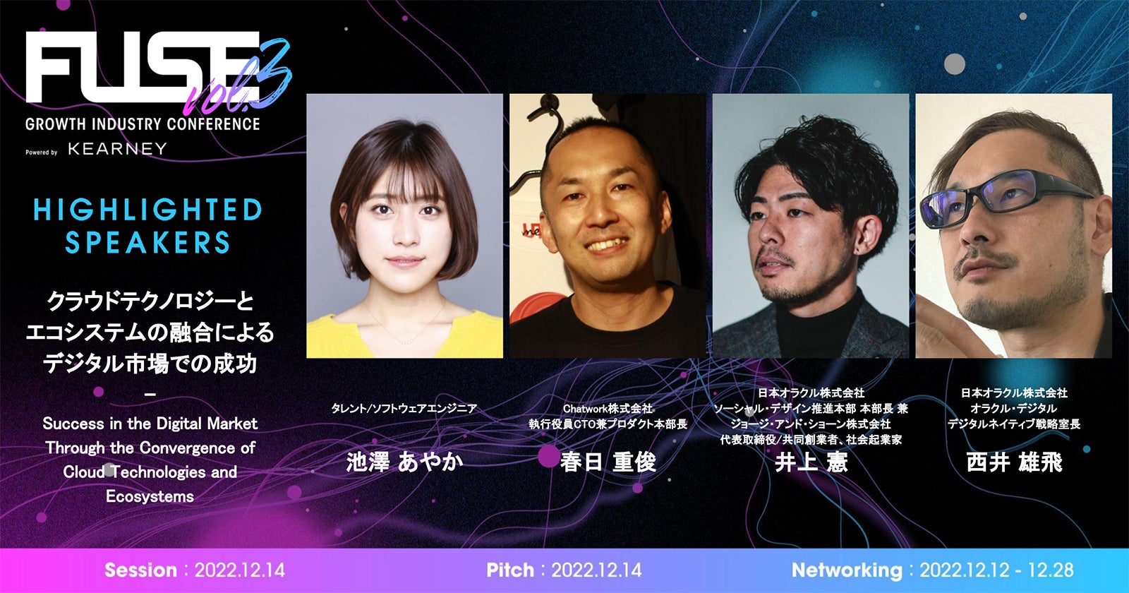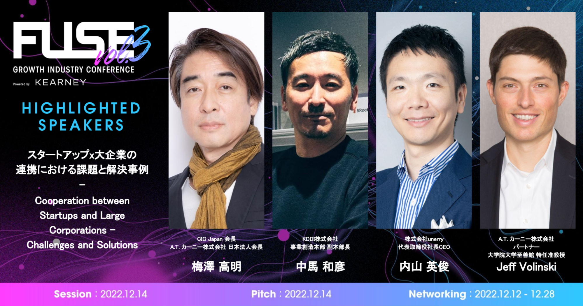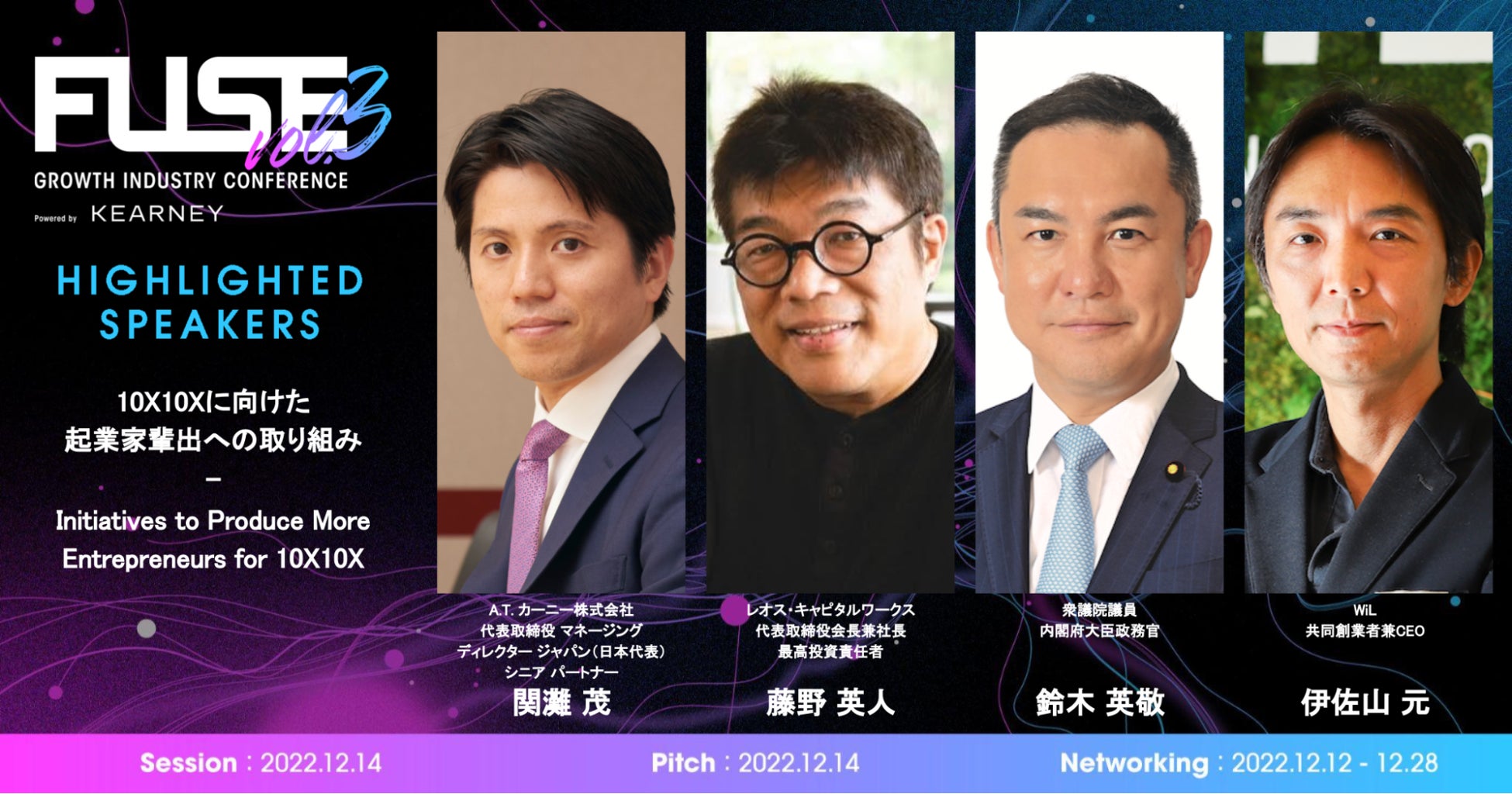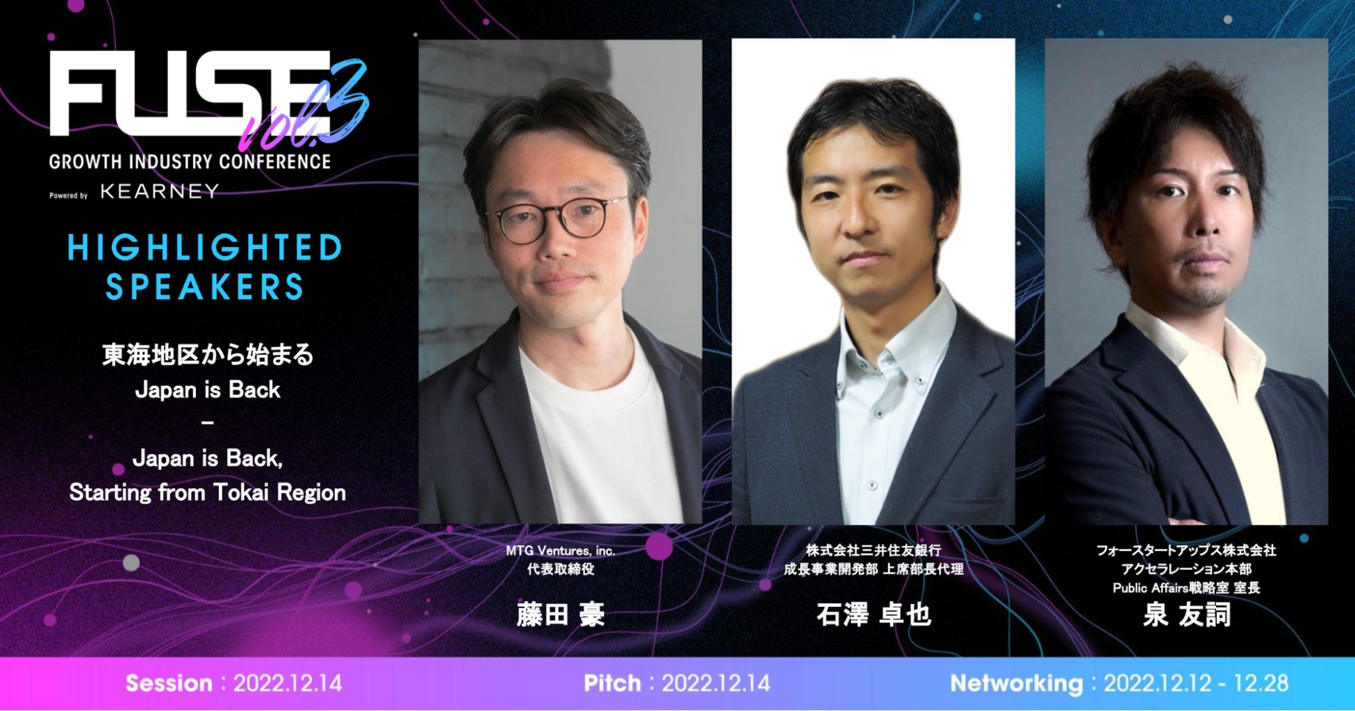 成長産業支援事業を推進するフォースタートアップス株式会社(本社:東京都港区、代表取締役社長:志水雄一郎 以下、フォースタートアップス)は、CIC Tokyo(本社:東京都港区虎ノ門、職務執行者: Timothy Rowe、以下「 CIC Tokyo」)と2022年12月14日(水)に開催する成長産業カンファレンス『FUSE』Vol.3 追加4セッション、並びにピッチコンテスト『DIVERS』登壇スタートアップ6社の情報を発表いたしました。
