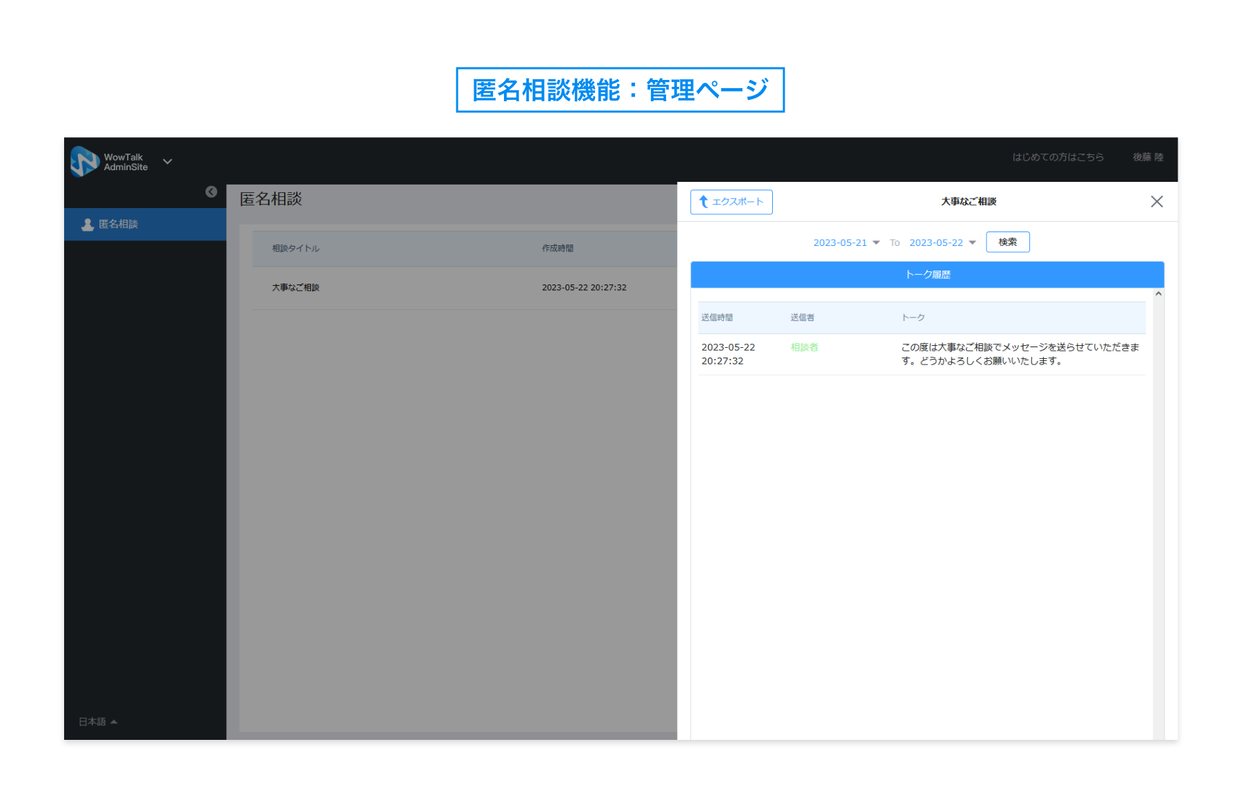 トークルーム内でのメッセージの送受信は、匿名相談トークを介する形でおこなわれます。またそのトークログは匿名相談機能の専用管理ページからのみ確認することが可能です。通常のWowTalk管理画面からエクスポート機能を利用してのダウンロードは不可であるため、WowTalkの管理者であっても匿名相談機能を使っておこなわれたやり取りの内容を閲覧することはできません。