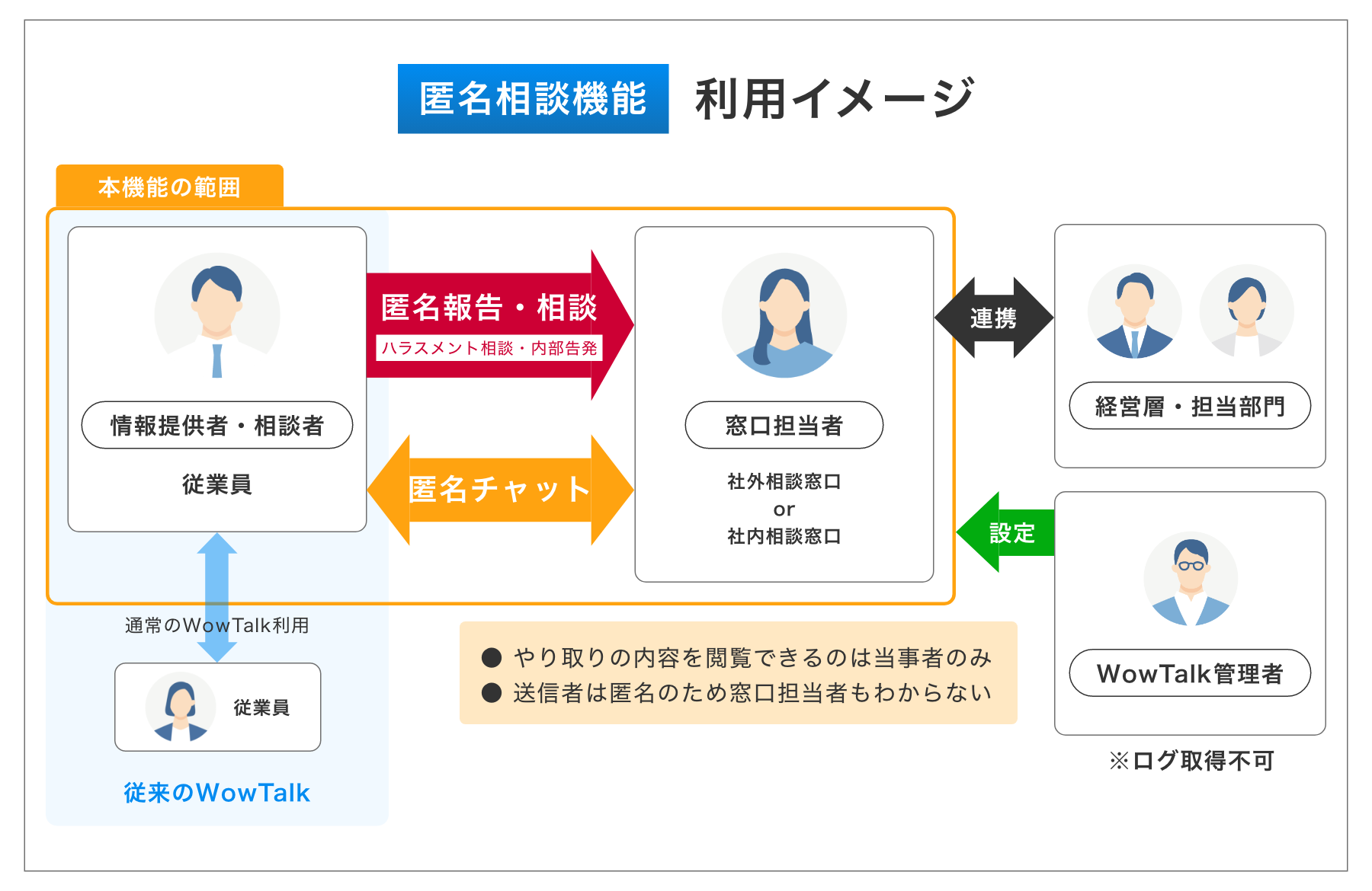 匿名相談機能は、WowTalk内で匿名のメッセージが送受信できる機能です。匿名性の確保により相談者が安心して利用できるほか、業務で利用頻度の高いチャットツールから利用できることで社員の利便性が高まり、相談窓口の利用率向上が見込めます。