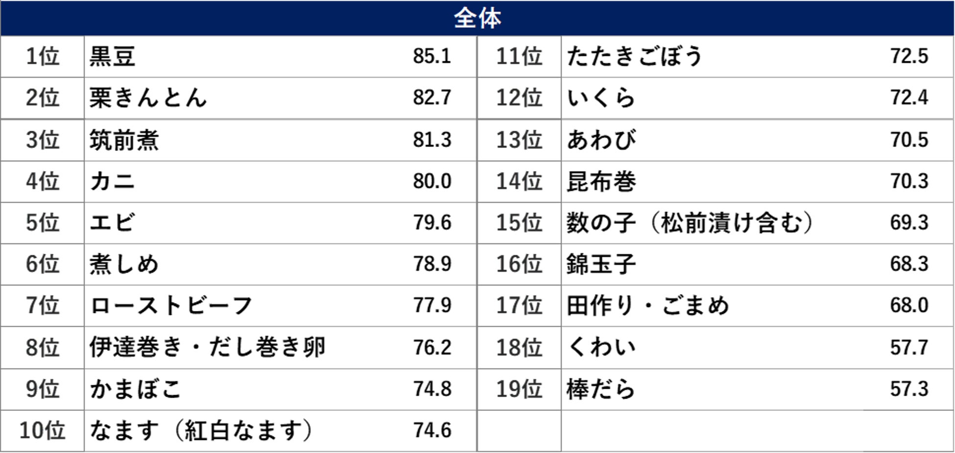 事前調査と本調査に分けて調査を実施。事前調査では「好きなおせち料理」を回答者1名あたり3項目まで自由記述で聴取し、回答が多かった20品目を選抜した。本調査では20品目についてそれぞれ7段階で評価を得た。