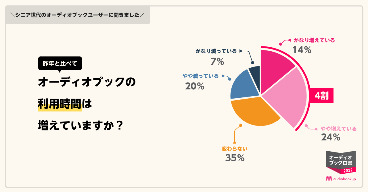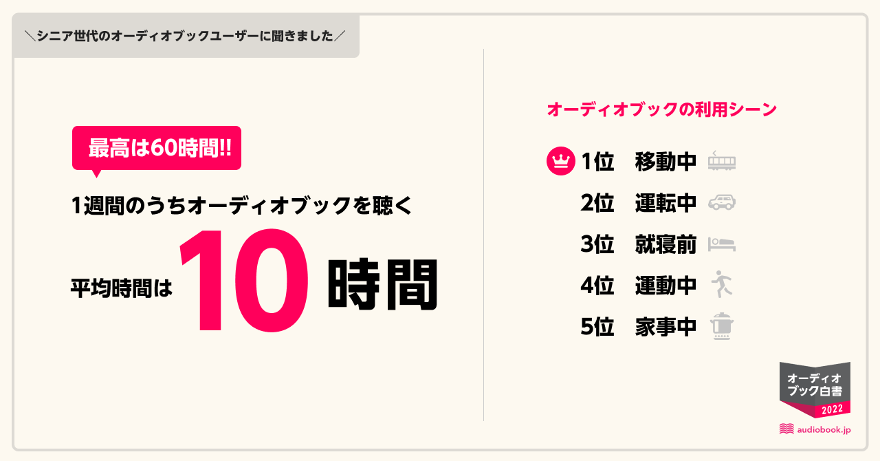 - 2、昨年と比べて利用時間が増えていると感じているシニアユーザーは4割。1週間のうちオーディオブックを聴く時間は平均10時間