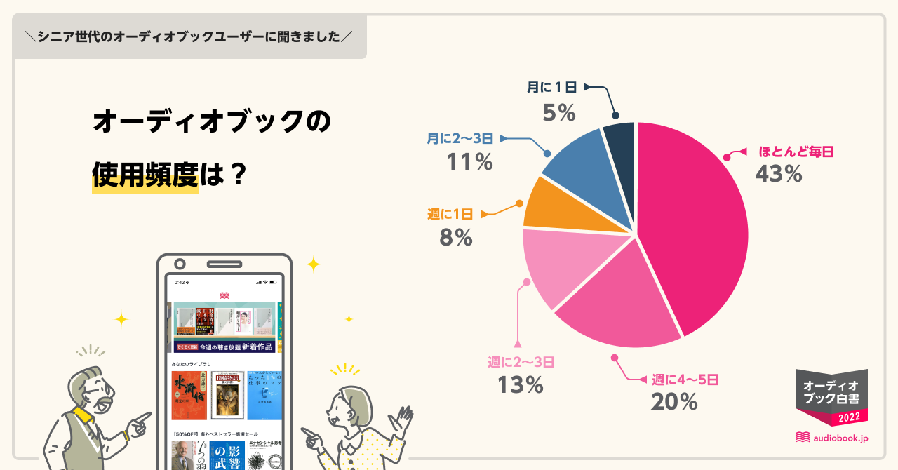 - 3、シニアユーザーの6割は、「ほとんど毎日(43%)」「週4~5日(20%)」と聴く頻度も高く、日々の生活にオーディオブックをとりいれている