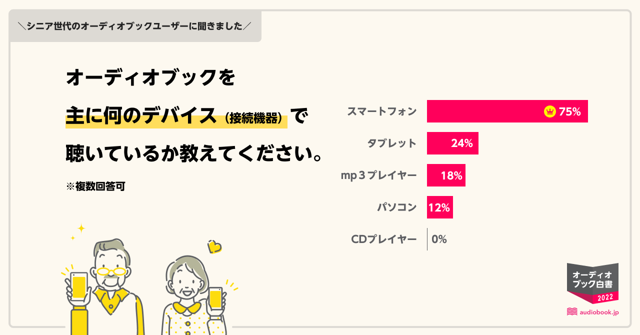 - 4、シニアユーザーの7割は「スマートフォン」を使用して聴いていると回答。デジタルやITの活用に前向きなスマートシニアが多い