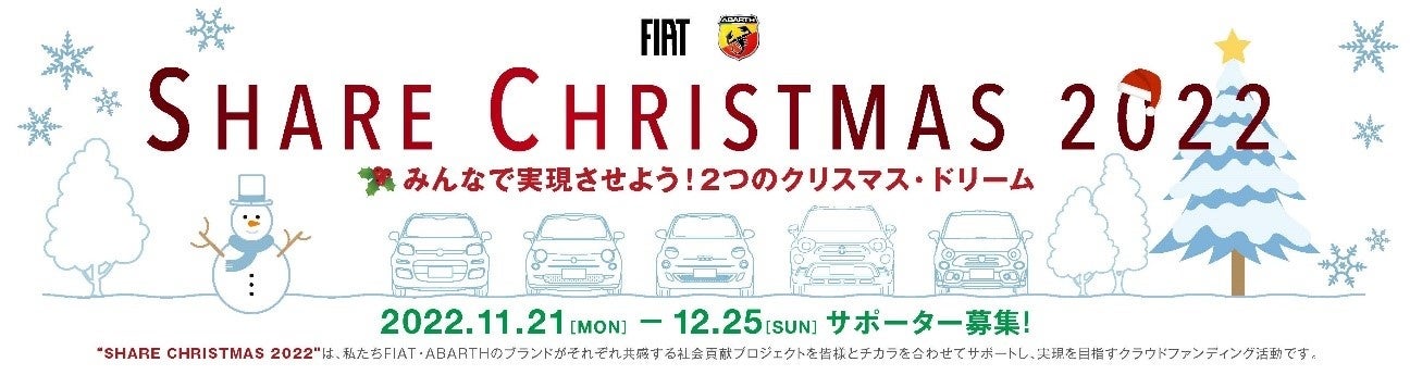 特定非営利活動法人ピースウィンズ・ジャパン(本部:広島県神石高原町、代表理事兼統括責任者:大西健丞)は、ステランティスジャパン株式会社(本社:東京都港区、社長:ポンタス・ヘグストロム)の取り扱いブランドである「FIAT(フィアット)」のサポートにより、クラウドファンディング「Share Christmas」に挑戦します。