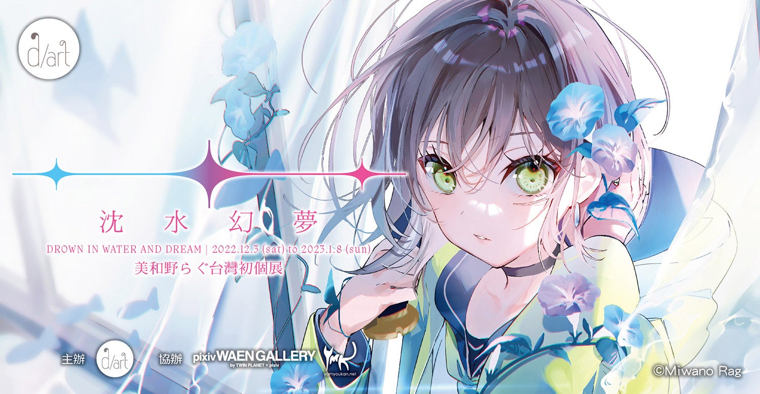 ピクシブ株式会社(本社:東京都渋谷区、代表取締役:國枝 信吾、以下ピクシブ)と株式会社ツインプラネット(本社:東京都渋谷区、代表取締役:矢嶋 健二)が両社で運営するギャラリー「pixiv WAEN GALLERY by TWIN PLANET × pixiv」は、原動力亜細亜有限公司(本社:台北市萬華区、代表取締役:石博文)が運営する台北西門町のギャラリー『d/art taipei』とコラボレーションし、「沈水幻夢│美和野らぐ台湾初個展」(協力:pixiv WAEN GALLERY)を2022年12月3日(土)より開催します。