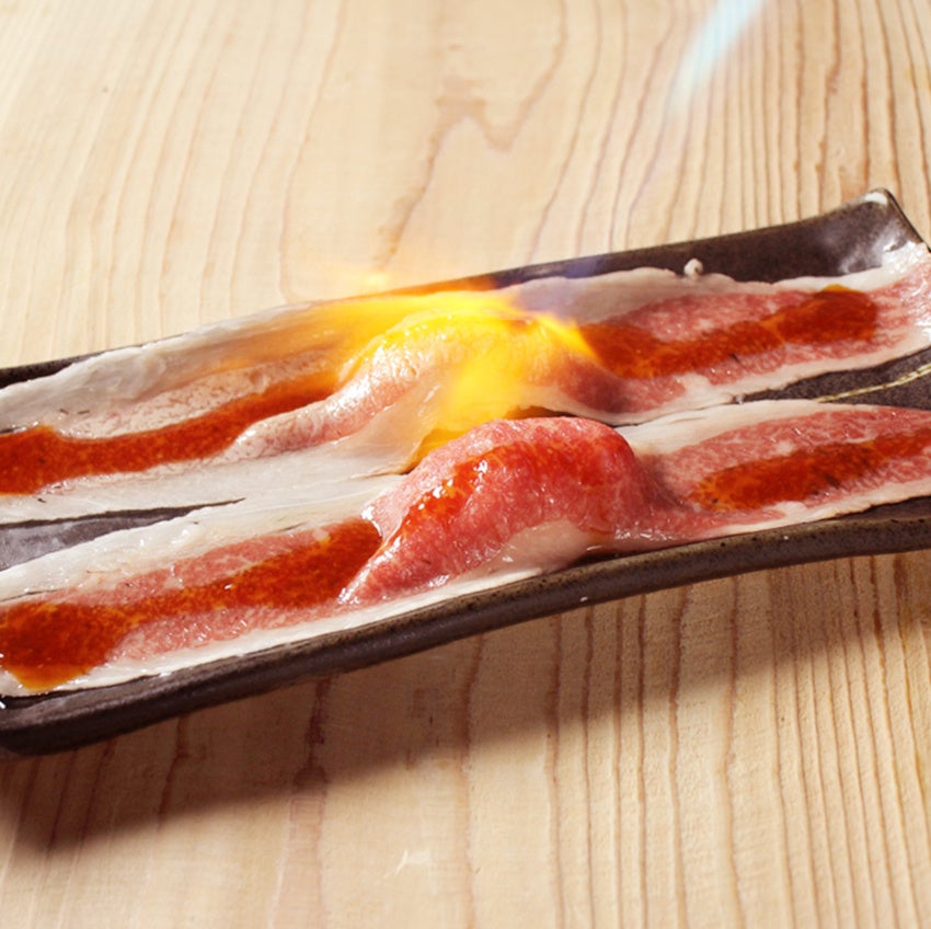 これを食べねば肉寿司は語れない!!当店の名物「さしとろ」国産牛のリブロースを贅沢に1枚使用!!拘りの岩塩とペッパーで味付け豪快に炙る。絶対に損はさせません!!(※一貫)