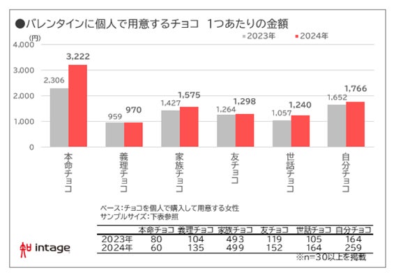 次に、チョコレートの種類ごとの1つあたりの平均金額を見ると、「本命チョコ」が3,222円で最も高く、「自分チョコ」(1,766円)、「家族チョコ」(1,575円)、「友チョコ」(1,298円)が続きました。「義理チョコ」は970円でした。さらに昨年と比較すると、「本命チョコ」(916円増)、「世話チョコ」(183円増)、「家族チョコ」(148円増)など、あらゆるチョコで1つあたりの金額が上昇しました(図表3)。これも予算の増加に寄与しています。