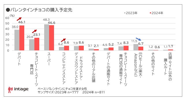 最後に、チョコをどこで買う予定かを見ると、「スーパー」が46.6%で最も高く、「デパート」(46.1%)、「チョコレート・スイーツ専門店」(23.1%)が続きます。昨年と比較して「デパート」が最も増え、次に「チョコレート・スイーツ専門店」、「コンビニエンスストア」が増えています。一方で、「ECモール(楽天・Amazonなど)」は昨年より減少し、購入先がECから実店舗へ戻ってきていると言えます(図表5)。