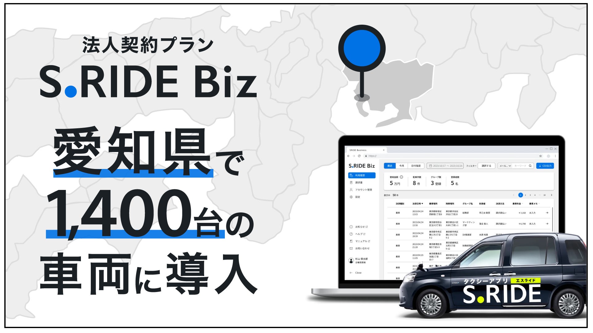 タクシーアプリ「S.RIDE®(エスライド)」を提供するS.RIDE株式会社(本社:東京都港区、代表取締役社長:橋本洋平)は、2025年9月11日より、法人契約プラン「S.RIDE Biz(エスライド ビズ)」を愛知県で初めて導入することをお知らせします。今回、カナレタクシー(香流運輸株式会社)、新川タクシー株式会社、つばめグループ、東和交通株式会社、帝産キャブ名古屋株式会社、中川タクシー株式会社、朝日タクシー株式会社の計7社が参画し、合計1,400台の車両で「S.RIDE Biz」のサービスを開始します。