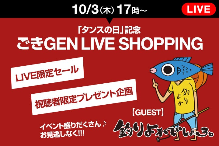 「タンスの日」の前日10月3日(木)17:00~は、タンスの日を記念したライブコマース配信を開催いたします。配信にはゲストとして人気クリエイターの「釣りよかでしょう。」をお迎えします。配信限定の釣りよかグッズプレゼント企画や限定セールも用意していますので是非ご覧ください。