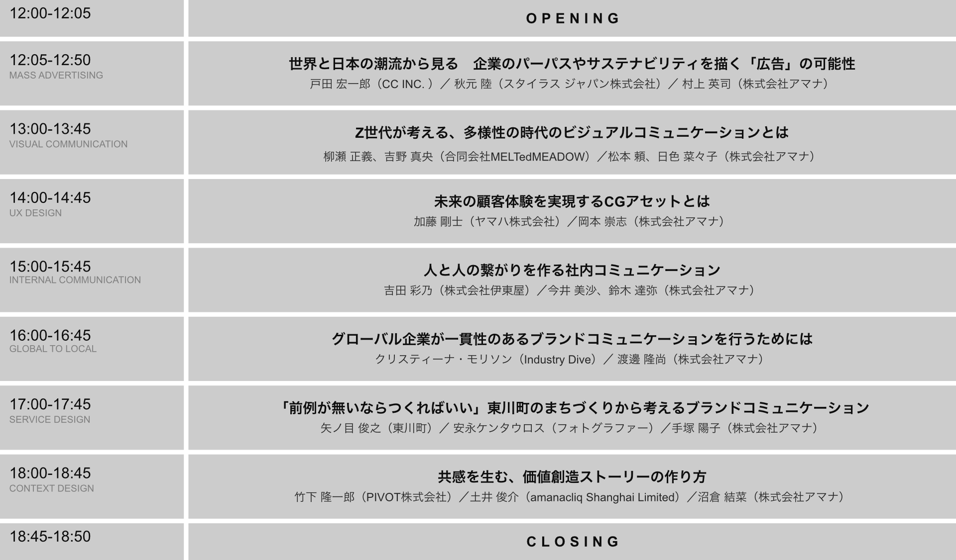 ※プログラムの内容・順序、所要時間は変更となる場合があります。各プログラム詳細は、https://insights.amana.jp/event/31362/をご覧ください。
