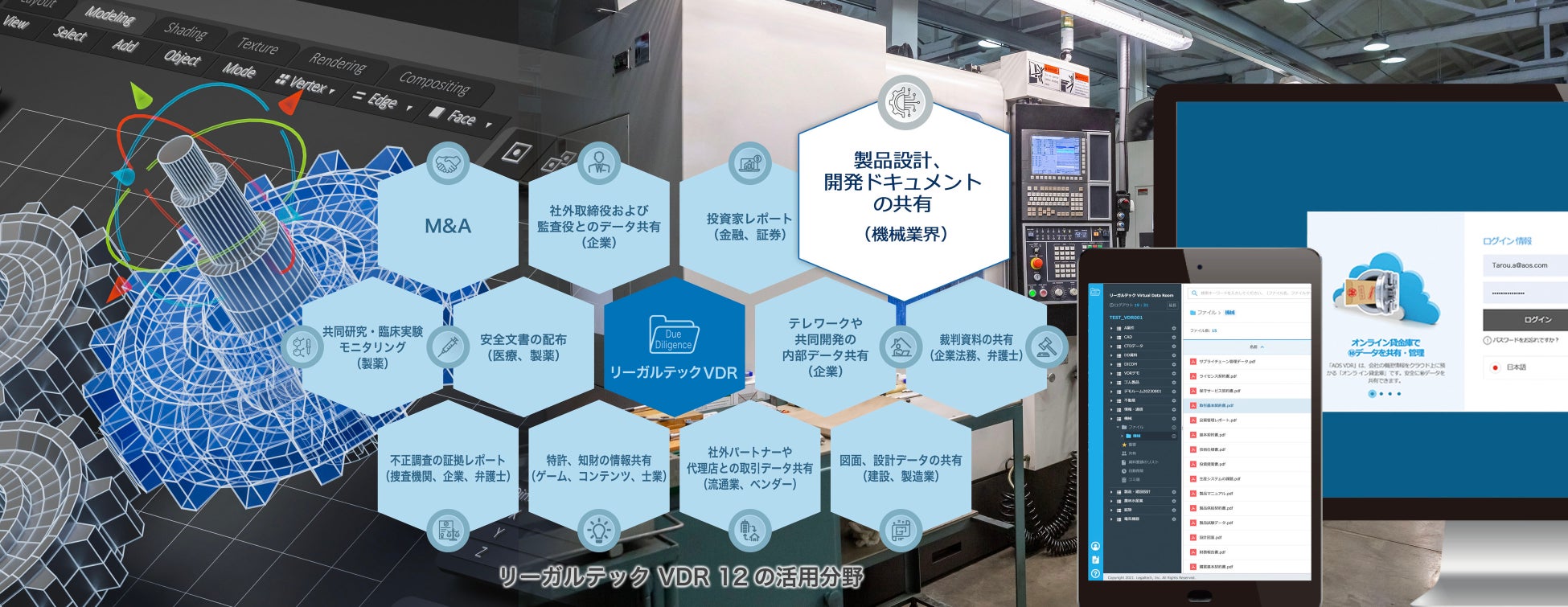 ソリューション: 「リーガルテックVDR 機械」は、機械業界のデジタル化を支援するため、重要な契約書や技術文書、設計図面、法務文書をデジタル形式で安全に管理・共有できます。これにより、企業間のコラボレーションが効率化され、契約締結プロセスやM&A活動が迅速に進められます。また、デジタルデータの一元管理により、企業全体の情報アクセスが容易になり、DXの促進に貢献します。