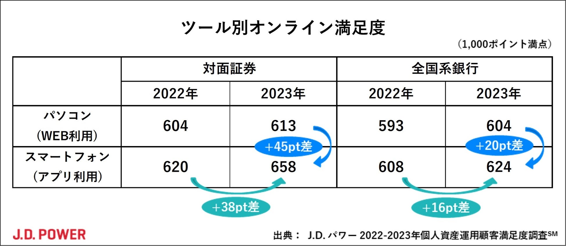 本年調査では、前年調査(2022年7月発表)に比べ、対面証券、全国系銀行を中心に満足度の向上が見られた。