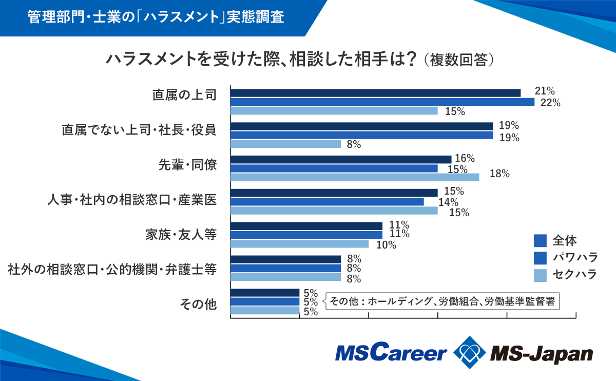 相談相手の第1位は「直属の上司(21%)」も、セクハラ被害の場合は「先輩・同僚」に相談