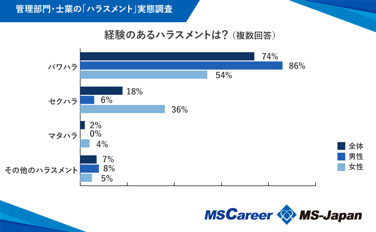 さらに、ハラスメント被害の経験がある人のうち、経験のあるハラスメントの種類についてたずねた項目では、最多回答は「パワハラ」の74%で、「セクハラ」は18%、「マタハラ」が2%、「その他のハラスメント」が7%という結果となりました。