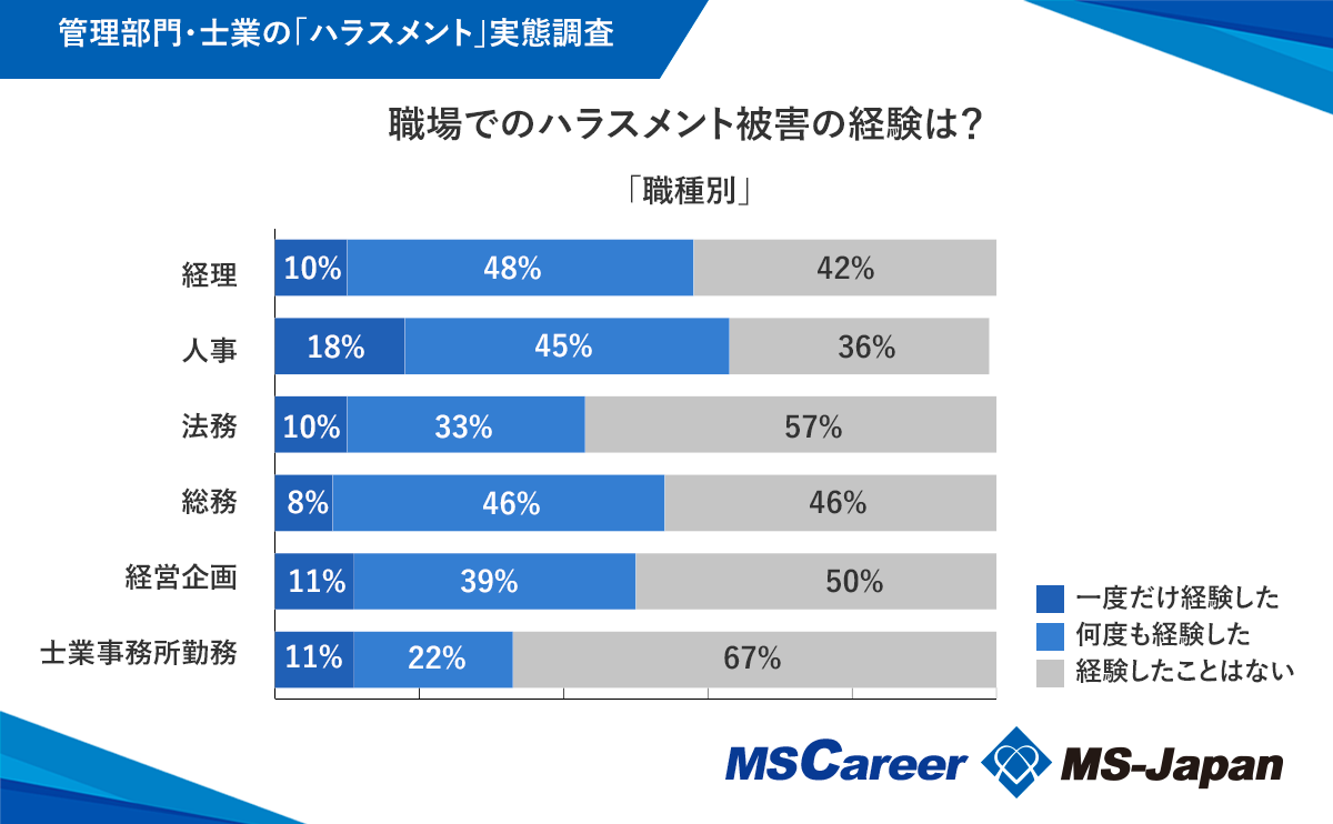さらに「職種別」では、ハラスメント被害経験がある人の割合が最も多かったのが「人事(64%)」、ついで「経理(58%)」と続く一方で、「士業事務所勤務」は33%と多職種と比べると少ない結果となりました。