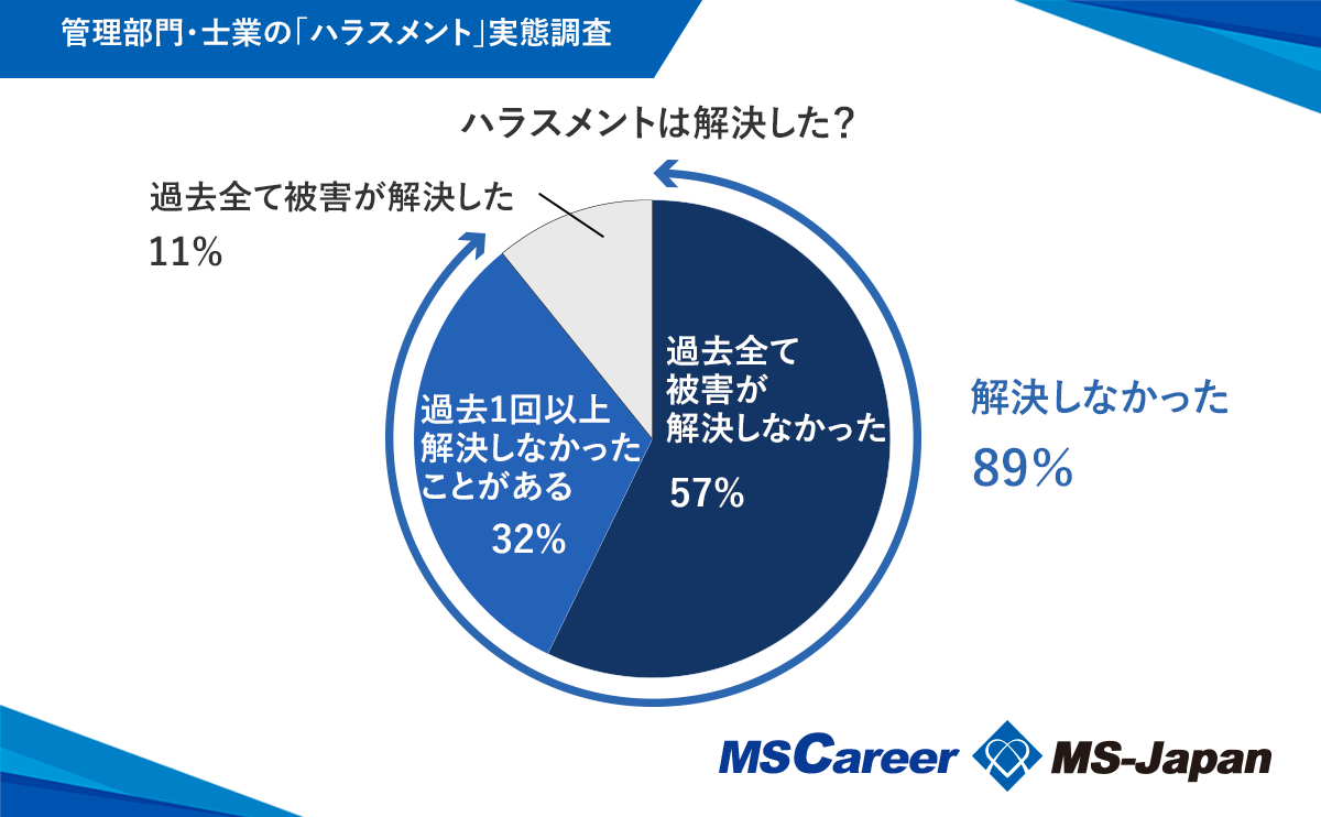ハラスメントを受けたことがある方に、その後の解決状況について調査を行うと、89%が「ハラスメントが解決しなかった経験がある」ことがわかりました。