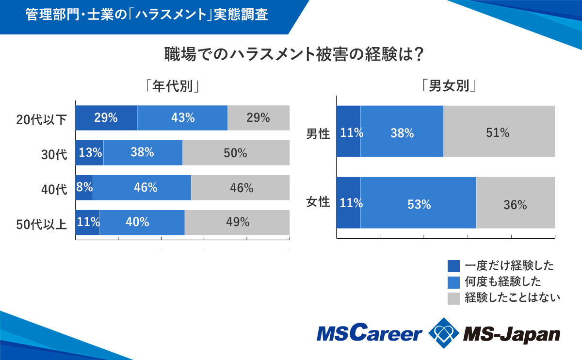 職場でのハラスメント被害の経験は、半数を超える52%が被害を経験していることがわかりました。