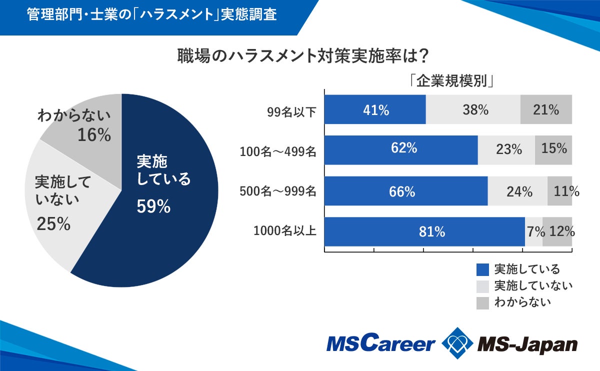 最後に、職場のハラスメント対策に関する調査では実施率59%と、まだまだ課題の残っていることが明らかになる結果となりました。