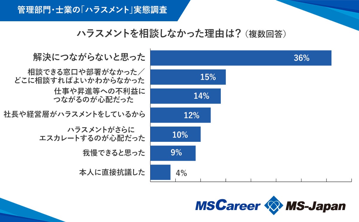 さらに、ハラスメント被害を「誰にも相談せずに我慢した」方に、「相談しなかった理由」について調査を行ったところ、最多回答は「解決につながらないと思った(36%)」で4割が解決をあきらめていること状況が明らかになりました。