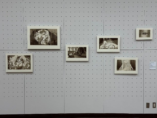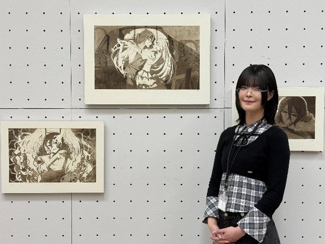 「画家の男の人とその男の人が作り上げた架空のキャラクターの二人をモチーフにして作品を制作しました。その二人の間にある恋人でも家族でもない特別な依存関係、静かな依存をテーマにしています。6枚の連作になっていて、全て視点を変えて描写することで世界観を伝えられたらなと思っています。銅版画での描写、アクアチントによる明暗差とか書き込みの量とかを見てほしいです。」