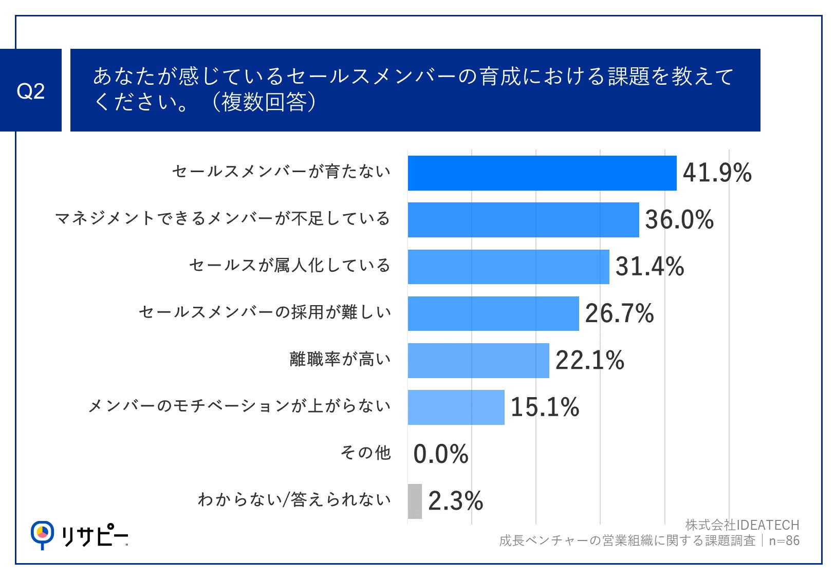 Q1で「非常に感じている」「やや感じている」と回答した方に、「Q2.あなたが感じているセールスメンバーの育成における課題を教えてください。(複数回答)」(n=86)と質問したところ、「セールスメンバーが育たない」が41.9%、「マネジメントできるメンバーが不足している」が36.0%、「セールスが属人化している」が31.4%という回答となりました。