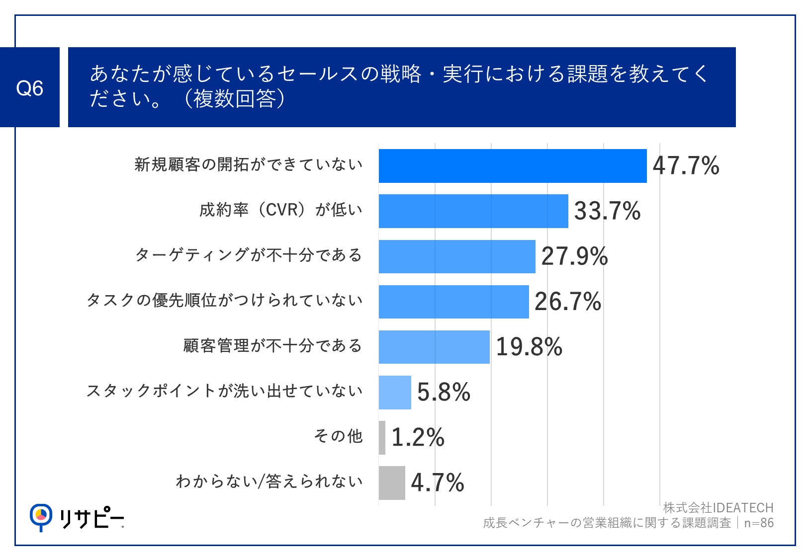 Q1で「非常に感じている」「やや感じている」と回答した方に、「Q6.あなたが感じているセールスの戦略・実行における課題を教えてください。(複数回答)」(n=86)と質問したところ、「新規顧客の開拓ができていない」が47.7%、「成約率(CVR)が低い」が33.7%、「ターゲティングが不十分である」が27.9%という回答となりました。
