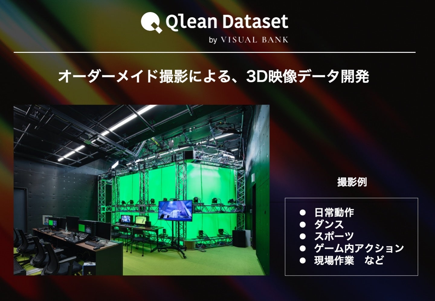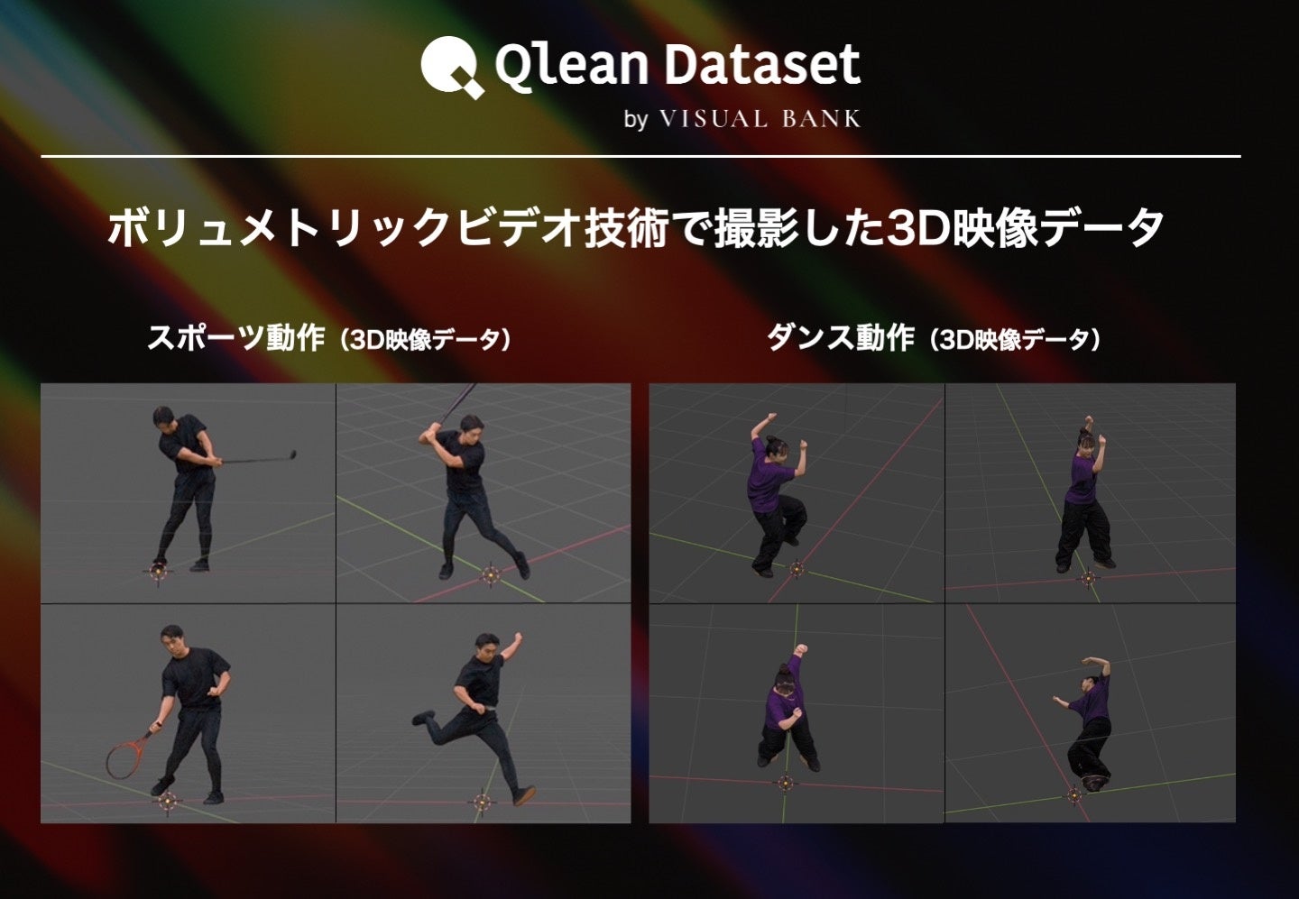 本サービスは、TOKYO NODE LABが運営するVOLUMETRIC VIDEO STUDIOをAI学習用の3Dデータの開発拠点として活用し、Visual BankのAI学習用データセット開発サービス『Qlean Dataset(キュリンデータセット)』を通じて3D映像データセットを開発・提供するものです。