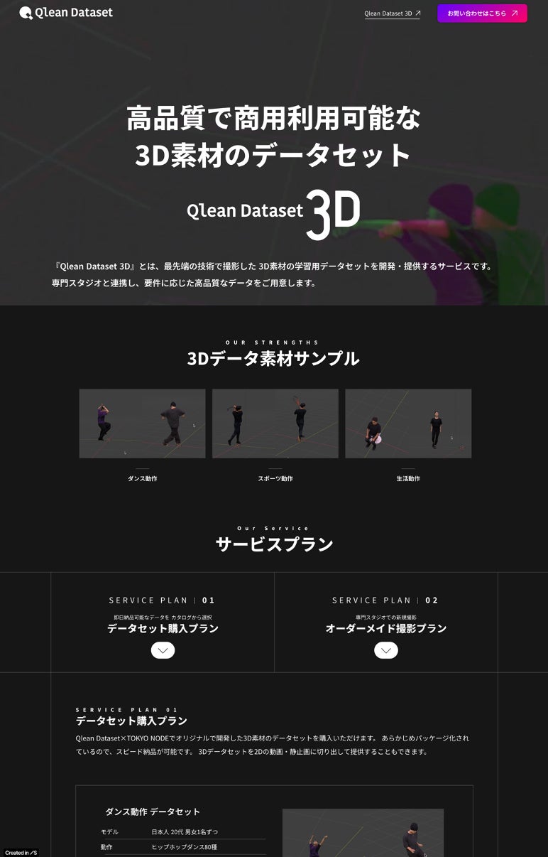 申込方法:Qlean Datasetサービスサイト(https://qleandataset.amanaimages.com/)のお問い合わせフォームより、「希望する3Dデータセットの種類(ダンス、スポーツ、一般動作いずれか)」を記入し送信してください。