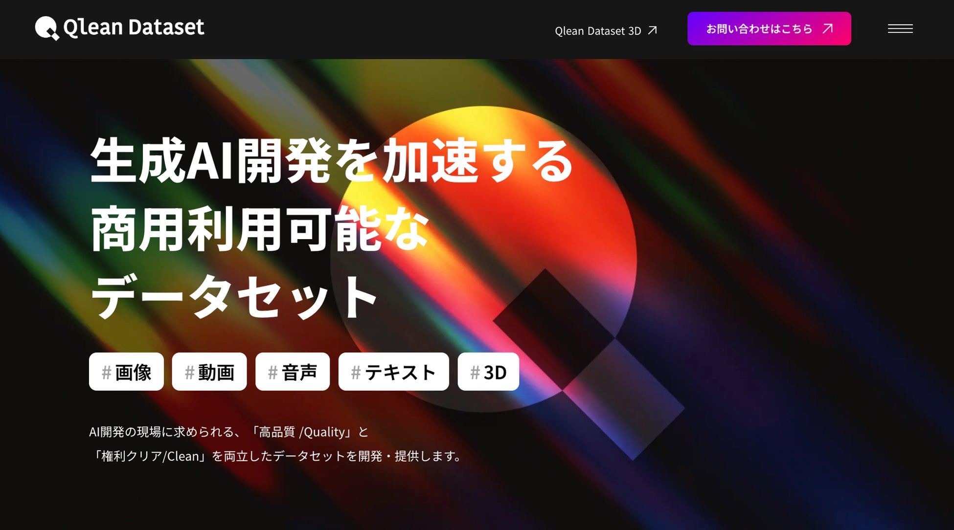 AI開発を加速するために、高品質かつ権利クリアなデータセットを開発するサービス。40年に渡る権利許諾の実績を持つアマナイメージズ(Visual Bankのグループ会社)が提供。画像・映像・テキスト・音声など多領域の「権利許諾済みデータベース」を基盤にデータセットを開発し、利用に応じた対価をデータ権利者に還元している。3社が連携して提供する『Qlean Dataset 3D』においては、データセットの企画・開発と販売機能を提供。