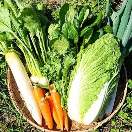 信州鍋用旬の野菜セット、白菜・長ネギ・小かぶ・ほうれん草・春菊・小松菜・水菜・にんじん・大根などから8品+おまけを厳選してお届けします。