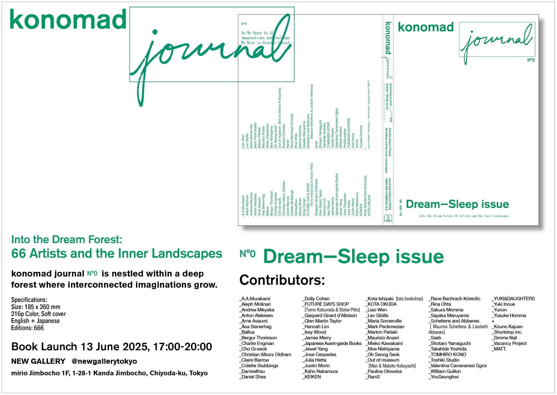 東京都千代田区・神保町にて2024年3月開廊、アートの新たな可能性を提案する気鋭のギャラリー「New Gallery」。本ギャラリーにて、河野富広と丸山サヤカが主宰するクリエイティブ・プラットフォーム konomad が発行するインディペンデントレーベル konomad editions の初ジャーナル『konomad journal N°0 : Dream—Sleep issue【夢・睡眠・森】』の創刊を記念し、同名テーマの企画展を 2025 年 6 月 13 日(金)から 7 月 3 日(木)まで開催します。