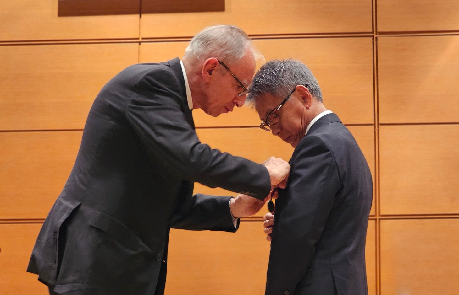 〔写真〕授章式の様子:ポーランド共和国外務副大臣(左)、吉原直樹(右)