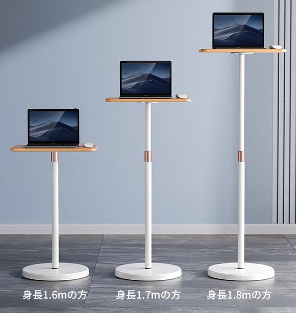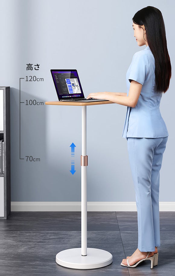 70cm〜120cmの範囲で調節できるので、一瞬で座り作業を立ち作業に切り替え、肩や首、腰の痛みから解放!コンパクトで簡単に移動可能なので、すべての場所が快適で効率的な仕事場へと変身します。長時間パソコンやタブレット端末で作業をされる方にはぜひおすすめ。
