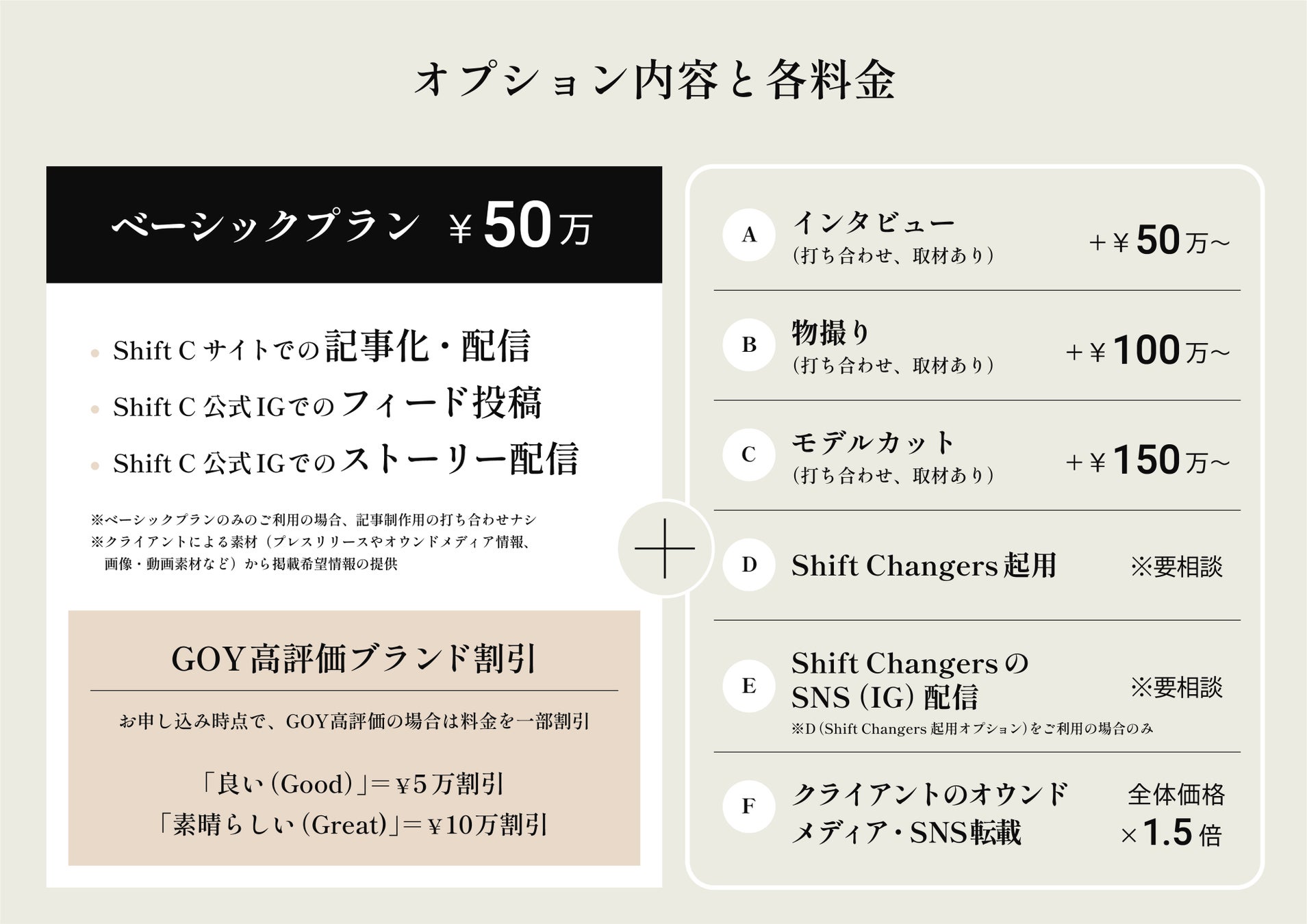 ■オプションD:Shift Changersによる取材と記事作成。※モデルカットにShift Changersを起用する場合はオプションCも併せて選択要。