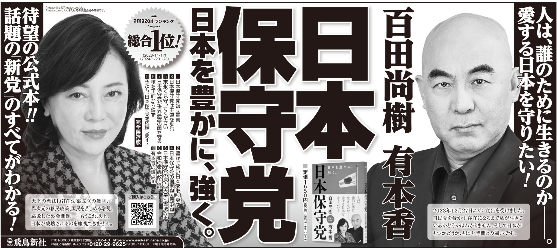 百田尚樹氏と有本香氏の共著『日本保守党~日本を豊かに、強く。~』(飛鳥新社)が発売即10万部を突破し話題となっている。