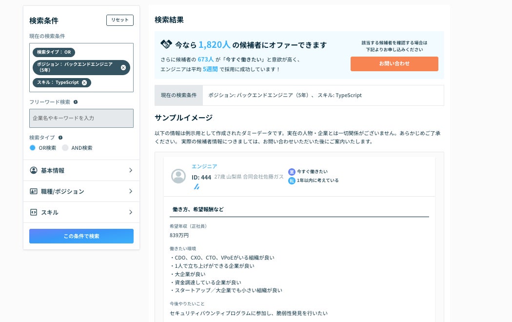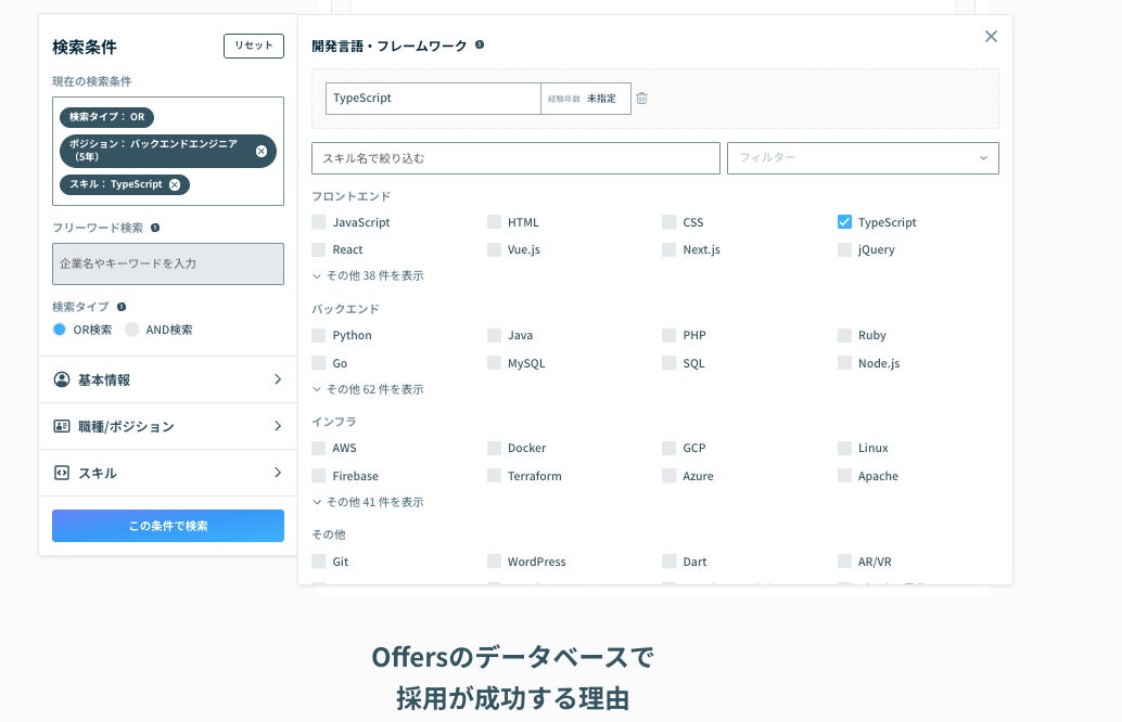 検索で利用できるスキルは300種類以上。「バックエンド経験5年以上、Typescript経験3年以上のエンジニア」といった具体的な条件での母数がたった60秒で確認できます。