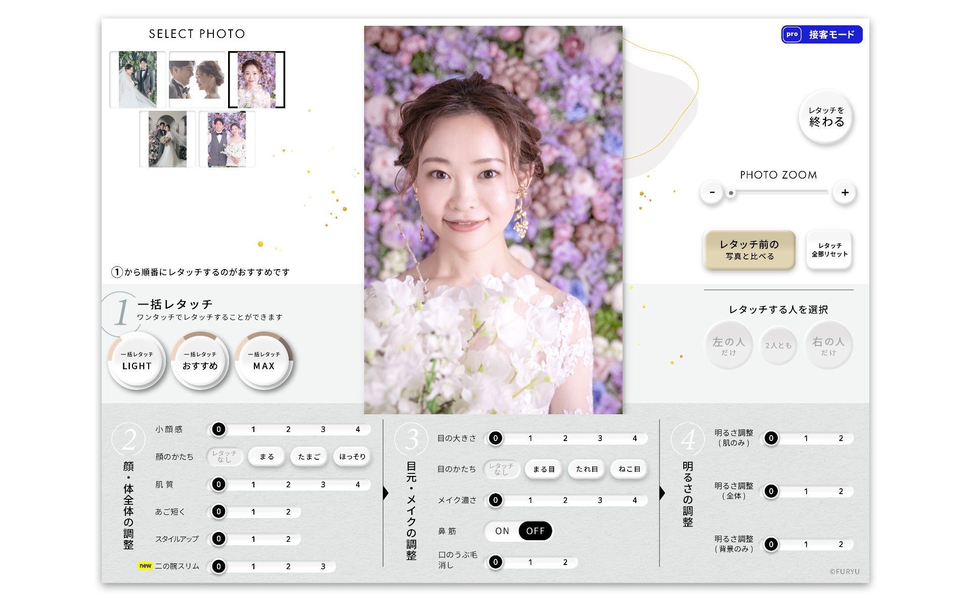 目の大きさや肌質、顔の形といった細かな箇所のレタッチを、自分好みにセレクトすることができます。顔・体全体5種類、目元・メイク5種類、明るさ3種類のレタッチが可能で、その組み合わせは1944万通り。新婦さまは目を大きく、新郎さまは小顔感UPをといったように、加工アプリのような一括修正ではなく、おふたりそれぞれでこだわりの仕上がりが選べます。