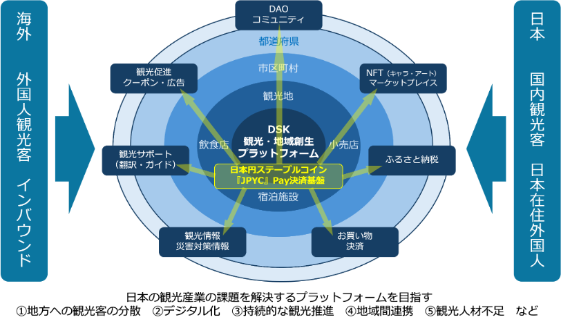 今回は、この構想の第二弾の協業として、上記2.に記載の『JPYC』次世代決済送金サービスの観光産業への普及、DAOコミュニティの運営、NFTやふるさと納税の決済、観光ガイドや翻訳サービスを提供する個人・団体への支払い、観光促進クーポン発行、などあらゆる決済・利用シーンに『JPYC』が本プラットフォームの基盤となるべく、JPYC社として『観光・地域創生プラットフォーム事業』へ積極的に参画し、共に活動してまいります。