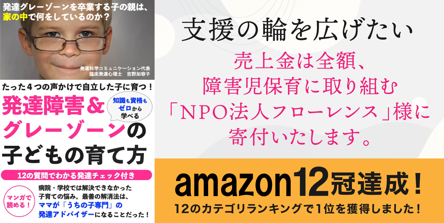 この度、発達障害やグレーゾーンの正しい理解と対応を伝えることで、子どもたちが生きやすい時代をつくるきっかけづくりをするWebサイト「パステル総研」を運営する(株)パステルコミュニケーションは、代表吉野加容子が執筆し、先月Kindle販売を開始した『発達障害&グレーゾーンの子どもの育て方 発達グレーゾーンを卒業する子の親は 家の中で何をしているのか? 〜12の質問で分かる発達チェックつき〜』の売上を障害のある子の保育を中心に幅広い支援活動をおこなっているNPO法人「フローレンス」様<https://florence.or.jp/>に全額寄付させて頂くことに決めました。