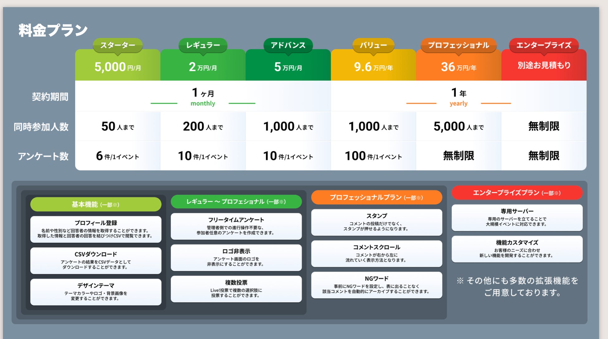 初めて「Live!アンケート」をお試しいただく方に向けたエントリープランです。小規模なイベントやセミナーなどでの活用に最適で、手軽に「Live!アンケート」の利便性をご体感いただけます。