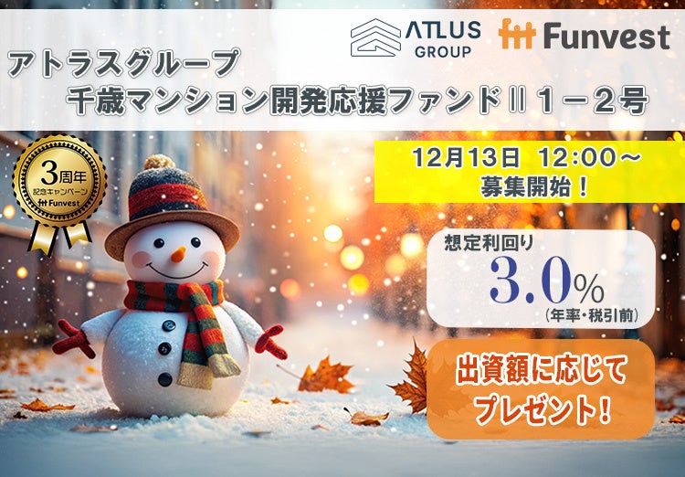 「未来をわかちあう投資」を提供する「Funvest(ファンベスト)」(以下、Funvest)は、「アトラスグループ 千歳マンション開発応援ファンドⅡ1-2号」(以下、本ファンド)の募集を12/13より開始しますので、お知らせいたします。